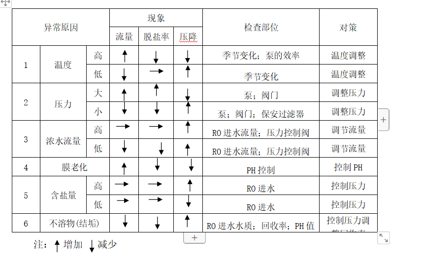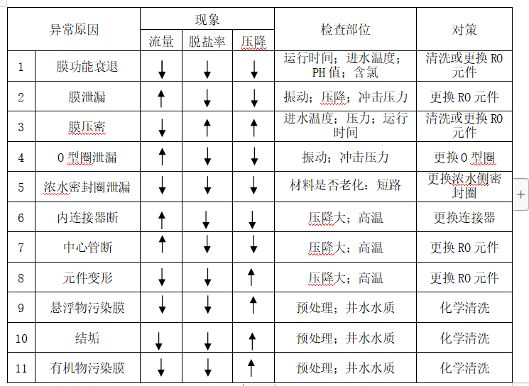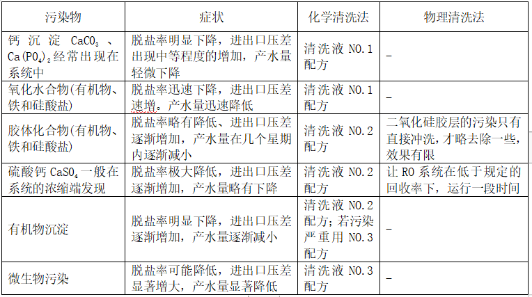 (1)裝置運行時如出現(xiàn)以下任一情況,則必須立即進行化學(xué)清洗。(在標(biāo)準(zhǔn)條件下,即壓力1.5MPa, 水溫25℃, 回收率75%)