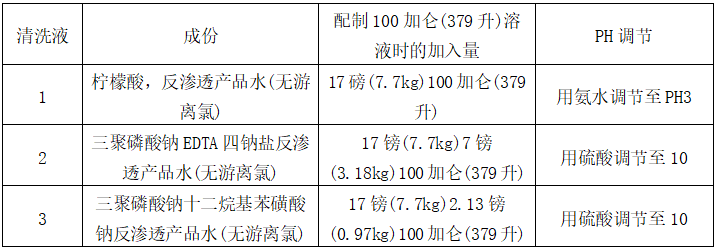 (b) 清洗液最高溫度為30℃,最高壓力為3.5kg/cm2,每一段清洗時間為45分鐘,用反滲透產(chǎn)水或無離子水配制溶液,溶液混合要均勻。