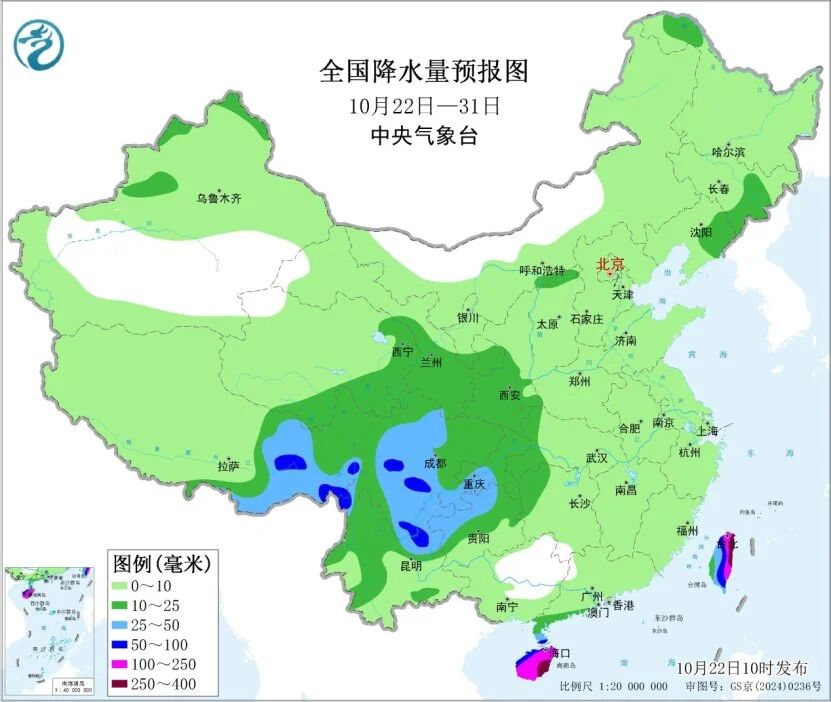 據(jù)預(yù)報,未來10天(10月22—31日),西北地區(qū)東南部、西南地區(qū)大部、西藏東部等地累計降水量有10~30毫米,局部50~70毫米;華南沿海及中國臺灣地區(qū)累計降水量達(dá)30~70毫米。